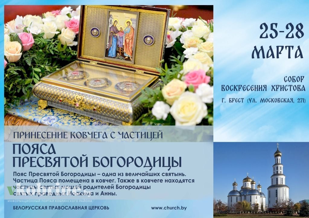 По благословению Его Высокопреосвященства, Высокопреосвященнейшего Иоанна, Архиепископа Брестского и Кобринского в соборе Воскресения Христова г. Бреста (ул. Московская, 271) с 25 по 28 марта 2024 года будет пребывать ковчег с частицей Пояса Пресвятой Богородицы и частицами мощей праведных Иоакима и Анны- родителей Пресвятой Богородицы.
