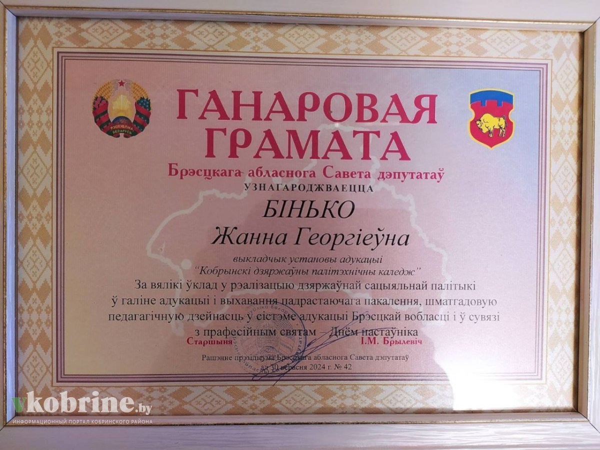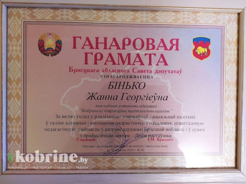 В торжественной обстановке состоялась церемония награждения выдающихся деятелей образовательной сферы, включая тех, кто посвятил себя благородному делу профессионального образования. Среди награждённых - педагог учреждения образования "Кобринский государственный политехнический колледж" Жанна Георгиевна Бинько.