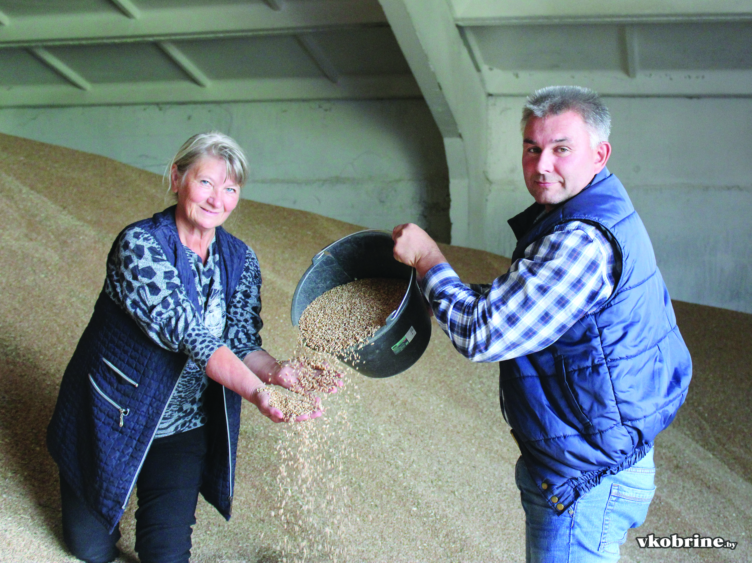 Іван Гусак правярае якасць захоўвання збожжа з кладаўшчыком цэнтральнага складаНадзеяй Горнавай.