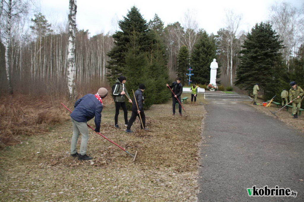 - Порядок здесь поддерживается всегда. – Рассказывает председатель Дивинского сельисполкома Вера Пикула, раздавая инвентарь школьникам, которые тоже хорошо знают историю сожжённой Борисовки и каждый год помогают с наведением порядка. – Следит за мемориалом местное ОАО «Дружба народов». После зимы здесь немного работы – убрать листву, разобраться с кустарниками, подмести дорожки.