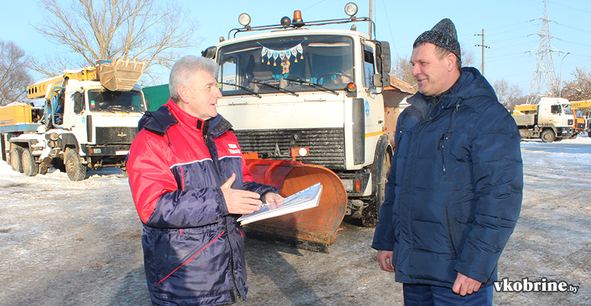 Анатолий ЯКИМОВИЧ (слева) и водитель снегоуборочного автомобиля Сергей ДУДАРУК обсуждают маршруты работы техники на улицах Кобрина перед выездом на линию.