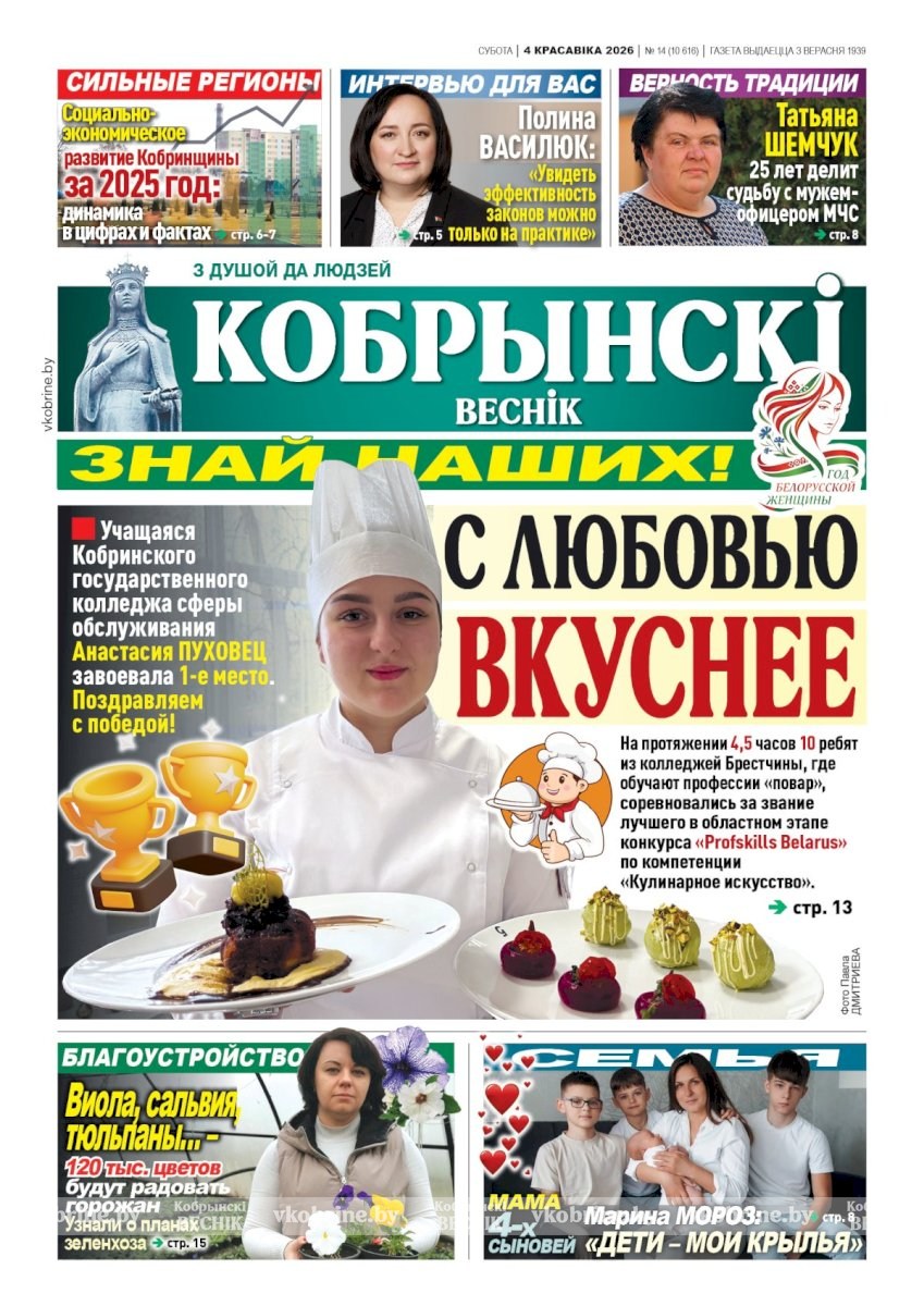 📰1, 13 стр. – С любовью вкуснее. На протяжении 4,5 часов 10 ребят из колледжей Брестчины, где обучают профессии «повар», соревновались за звание лучшего в областном этапе конкурса «Profskills Belarus» по компетенции «Кулинарное искусство». Учащаяся Кобринского государственного колледжа сферы обслуживания Анастасия ПУХОВЕЦ завоевала 1-е место;