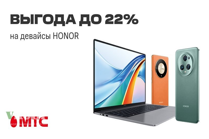 В салонах связи и интернет-магазине МТС снижены цены на гаджеты HONOR. Смартфоны, планшеты и ноутбуки доступны со скидкой до 22%.Их можно приобрести в рассрочку до 24 месяцев без первого платежа.