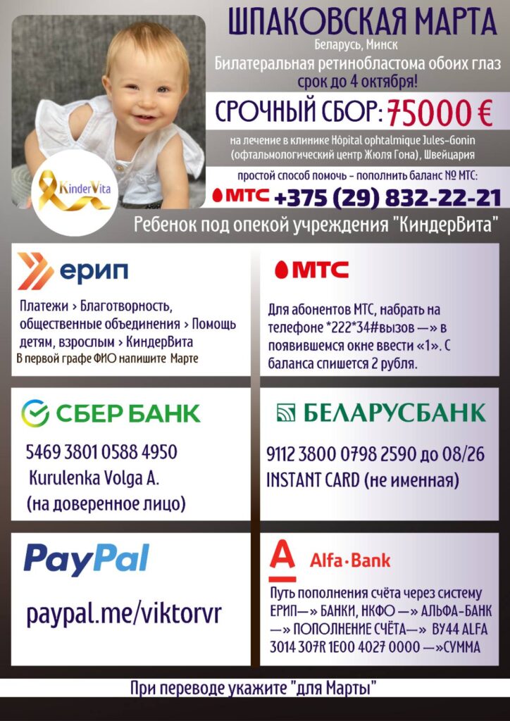 В этот миг моя душа и сердце разбились на миллион осколков криком отчаяния, истерикой и диким ужасом. Наши врачи сделали всё, что могли, они не в силах помочь... Но в Швейцарии известный профессор Мунье сотворил не одно чудо, он спасал детские жизни и возвращал зрение. У Марты есть все шансы спасти глаза и свою жизнь, но, чтобы уехать и начать лечение, необходимо 75000 евро (с учетом дополнительных расходов на перелет, длительное проживание, переводчика и оформление виз). Уже 7 октября малышку ждут в клинике!