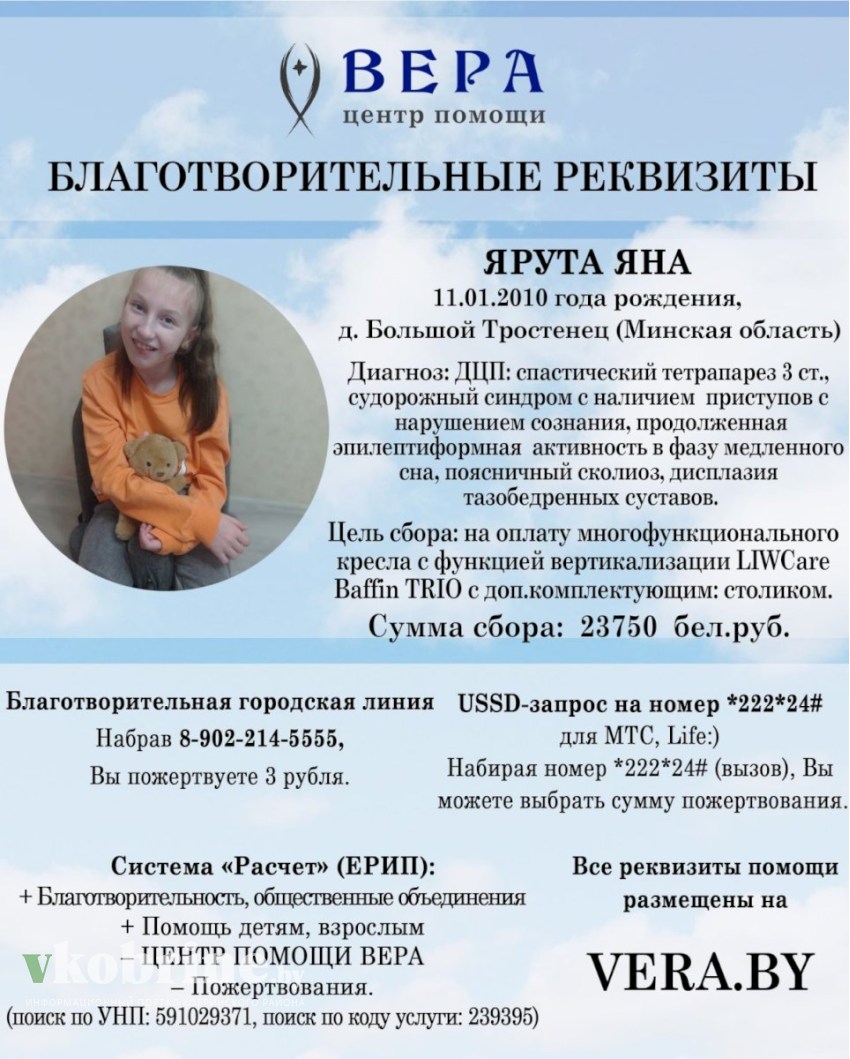 Центр помощи «Вера» начинает ведение благотворительного сбора в поддержку Яны Ярута из Минской области. Поддержать девочку можно с помощью посильного пожертвования на благотворительные реквизиты Центра с указанием назначения платежа «Яна Ярута». Для оказания помощи юридическими лицами необходимо связаться со специалистами Центра по телефону +375 33 61 333 61.
